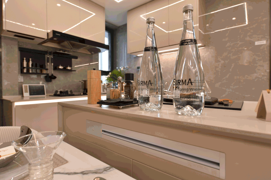 橱柜收纳系统:出格预置洗碗机点位、柜内下拉篮式设想、不锈钢挡油板、柜下操做灯、烹调全流程功能动线一体化设想;